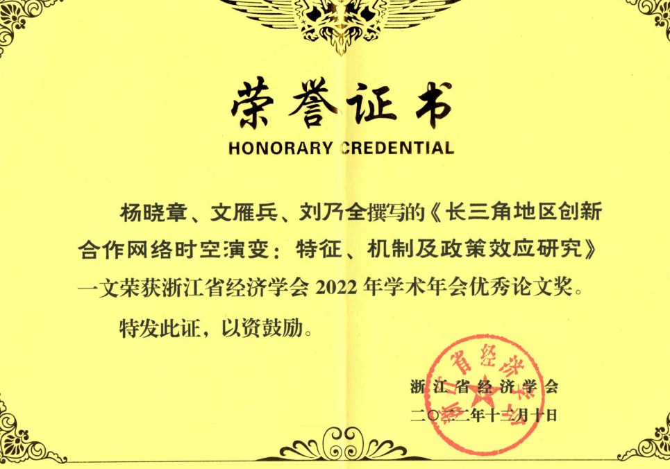 本次学术年会共征集近百篇高质量论文,其中48篇论文入选线上分论坛交流。经本届年会组委会专家严格评审,黑料不打烊 杨晓章博士递交的学术论文《长三角地区创新合作网络时空演变:特征、机制及政策效应研究》荣获浙江省经济学会2022年学术年会优秀论文奖。