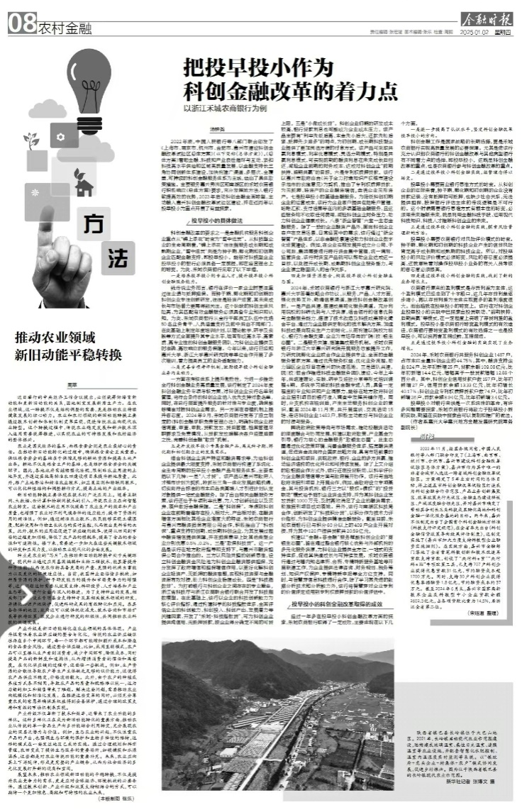 科技金融是落实创新发展理念、促进产业和科技深度融合、实现经济高质量发展的重要驱动力。科技创新与金融服务的深度融合已成为推动经济社会发展的新引擎。2023年10月30-31日的中央金融工作会议明确提出要做好科技金融的大文章。2024年11月5日,中国人民银行行长潘功胜在第十四届全国人民代表大会常务委员会上提出,要引导金融资本投早、投小、投长期、投硬科技。嘉兴市是我国科创金融改革试验区唯一地级市,正在全力打造长三角科技成果转化高地和科创金融一体化服务基地,在全面深化科创金融改革方面走在全国前列。主要服务嘉兴秀洲区和南湖区的禾城农商银行积极响应《总体方案》要求,充分发挥地方法人银行敏捷高效的优势,2023年启动科创金融全面转型,主动融入嘉兴科创金融改革试验区建设,并在近两年以投早投小为重点开展了有益探索,有望在实践中探索出可以复制和推广的做法。