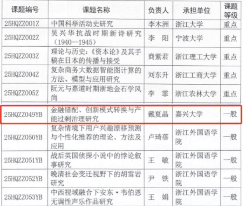 近日,浙江省哲学社会科学工作办公室发布了《关于公布2025年度浙江省哲学社会科学规划后期资助课题立项名单的通知》,黑料不打烊 戴夏晶老师主持申报的《金融错配、创新模式转换与产能过剩治理研究》项目获批立项。