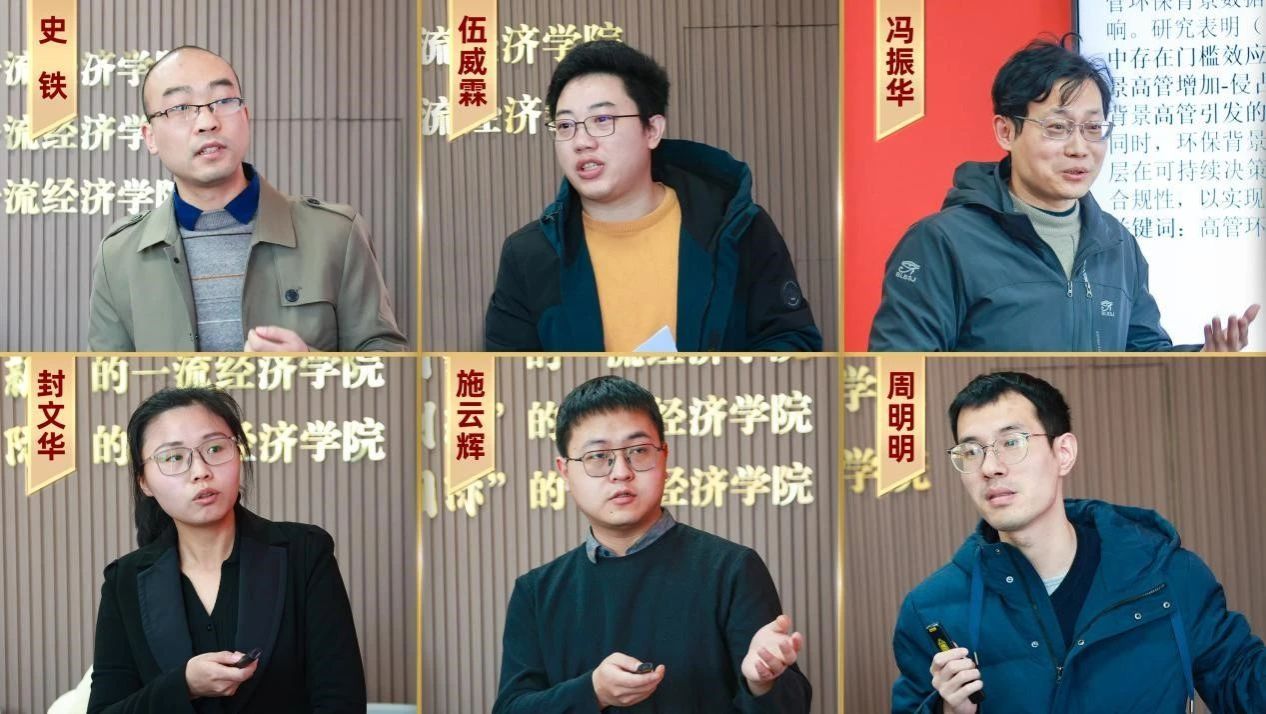 在报告环节,数字经济系史铁博士、国际经济与贸易系伍威霖博士、数字经济系冯振华副教授,以及科创金融系封文华博士、施云辉博士、周明明博士三位博士分别进行题为“Temperature effects on residential electricity consumption in northern China: Evidence from smart meters data”“Technostress and Workforce Productivity in Emerging Markets: The Hidden Costs of Personal Learning Initiatives”《高管环保背景、绿色并购与企业风险》《国际资本流动“突然停止”冲击与非金融企业融资约束——基于全球上市企业的实证分析》《创新专利盒制度降低了中国企业海外专利申请壁垒吗?——兼论技术封锁风险规避》《公共服务与城市创业活力:理论与实证》的学术论文汇报。