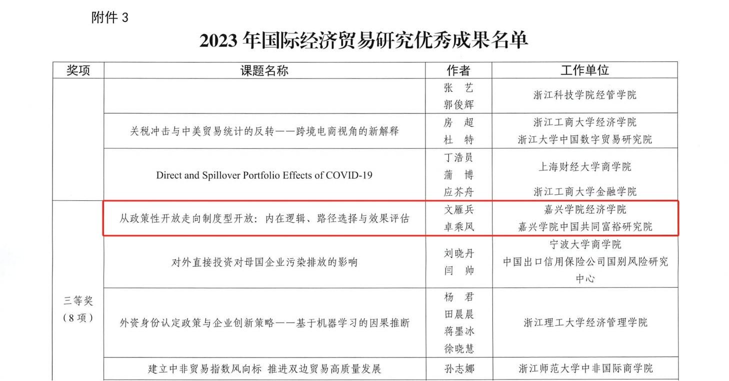 近日,浙江省商务厅发布《浙江省商务厅关于公布2023年度对策类课题及国际经济贸易研究优秀成果名单的通知》(浙商务发〔2023〕93号),黑料不打烊 高晓娜博士、李萍副教授主持完成的两项课题顺利结项,其中高晓娜博士主持的《浙江省数字服务贸易发展现状、制约因素及对策建议》获2023年对策课题三等奖;文雁兵教授和卓乘风博士的合作成果《从政策性开放走向制度型开放:内在逻辑、路径选择与效果评估》获2023年国际经济贸易研究优秀成果三等奖。