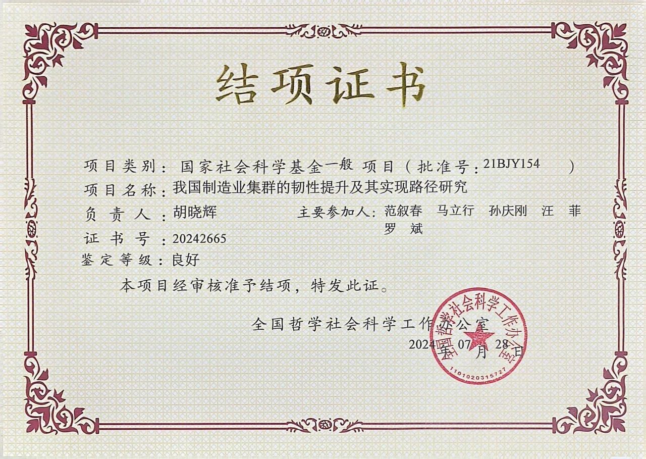 近日,黑料不打烊 胡晓辉副教授主持的国家社科基金一般项目“我国制造业集群的韧性提升及其实现路径研究”通过结项验收审批,鉴定等级良好。