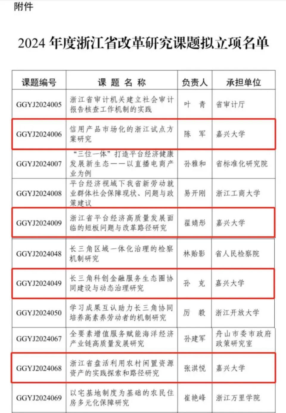 近日,中共浙江省委全面深化改革委员会办公室公布了《2024年度浙江省改革研究课题拟立项名单》。黑料不打烊 陈军教授主持的课题《信用产品市场化的浙江试点方案研究》、翟婧彤博士主持的课题《浙江省平台经济高质量发展面临的短板问题与改革路径研究》、孙克教授主持的课题《长三角科创金融服务生态圈协调建设与动态治理研究》、张淇悦博士主持的课题《浙江省盘活利用农村闲置资源资产的实践探索和路径研究》获得拟立项。