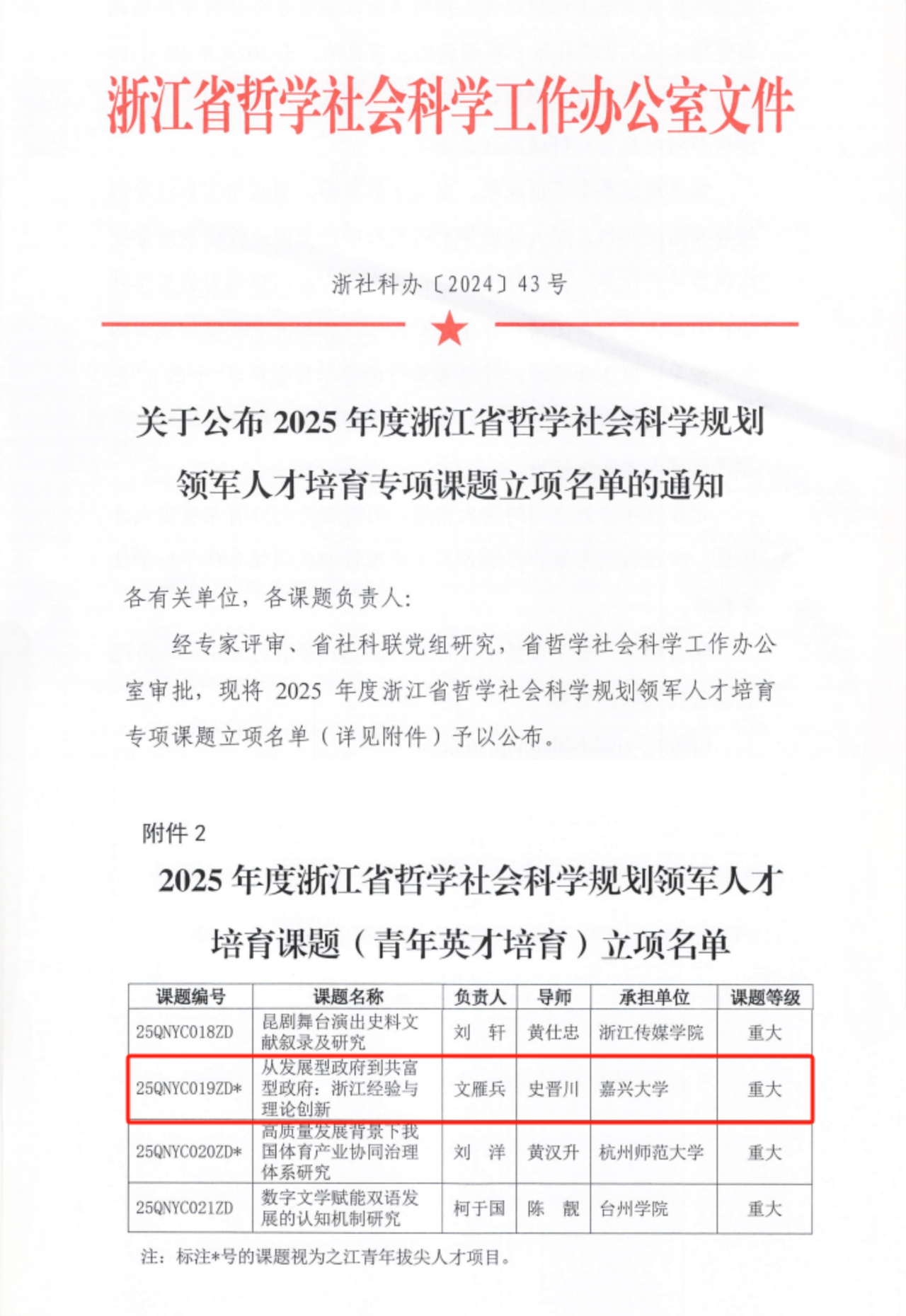 近日,浙江省哲学社会科学工作办公室公布了2025年度浙江省哲学社会科学规划领军人才培育专项课题立项名单,黑料不打烊 文雁兵教授主持申报的《从发展型政府到共富型政府:浙江经验与理论创新》获2025年度浙江省哲学社会科学规划领军人才培育课题(青年英才培育)立项。