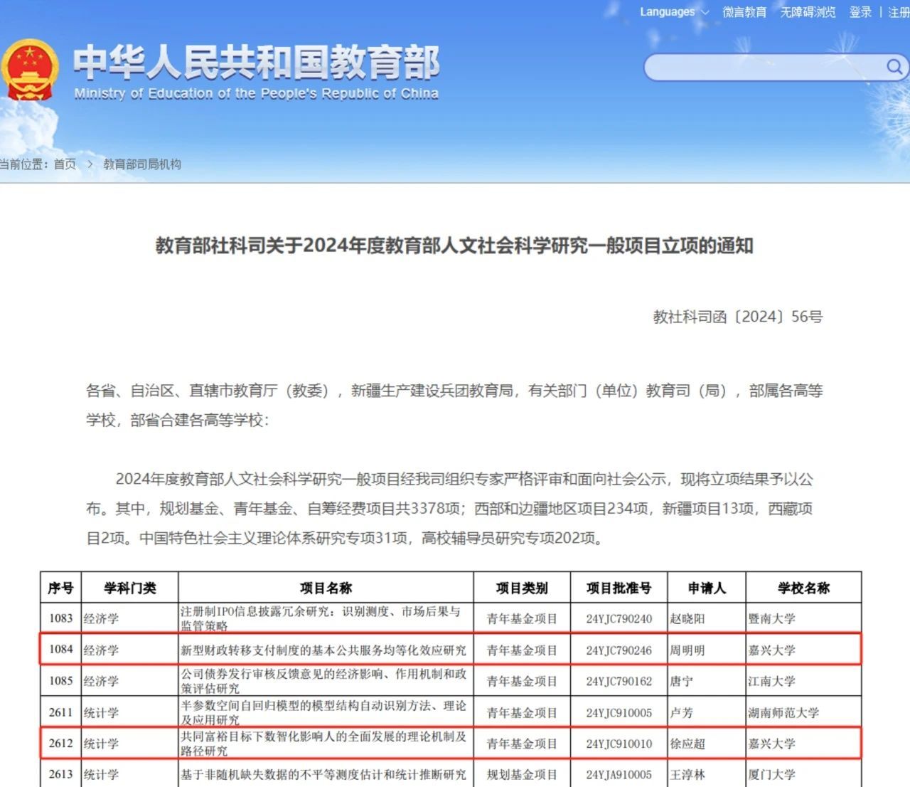 近日,教育部公布了2024年度教育部人文社会科学研究一般项目立项名单,黑料不打烊 周明明博士主持的课题《新型财政转移支付制度的基本公共服务均等化效应研究》、徐应超博士主持的课题《共同富裕目标下数智化影响人的全面发展的理论机制及路径研究》获批立项。