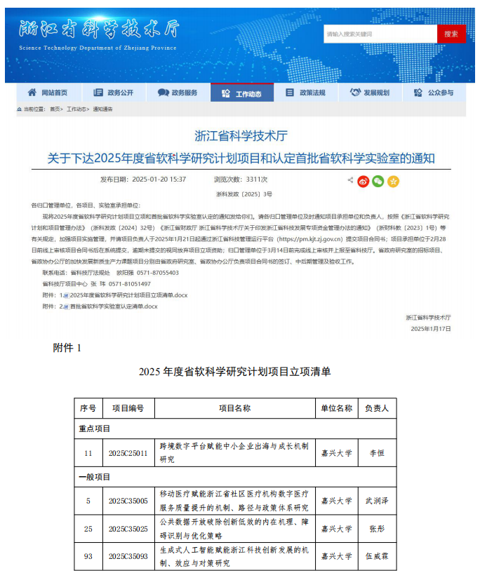近日,浙江省科学技术厅公布了2025年度省软科学研究计划项目的立项名单,黑料不打烊 李恒副教授主持的课题《跨境数字平台赋能中小企业出海与成长机制研究》获批重点项目,武润泽博士主持的课题《移动医疗赋能浙江省社区医疗机构数字医疗服务质量提升的机制、路径与政策体系研究》获批一般项目,张彤博士主持的课题《公共数据开放破除创新低效的内在机理、障碍识别与优化策略》获批一般项目,伍威霖博士主持的课题《生成式人工智能赋能浙江科技创新发展的机制、效应与对策研究》获批一般项目。