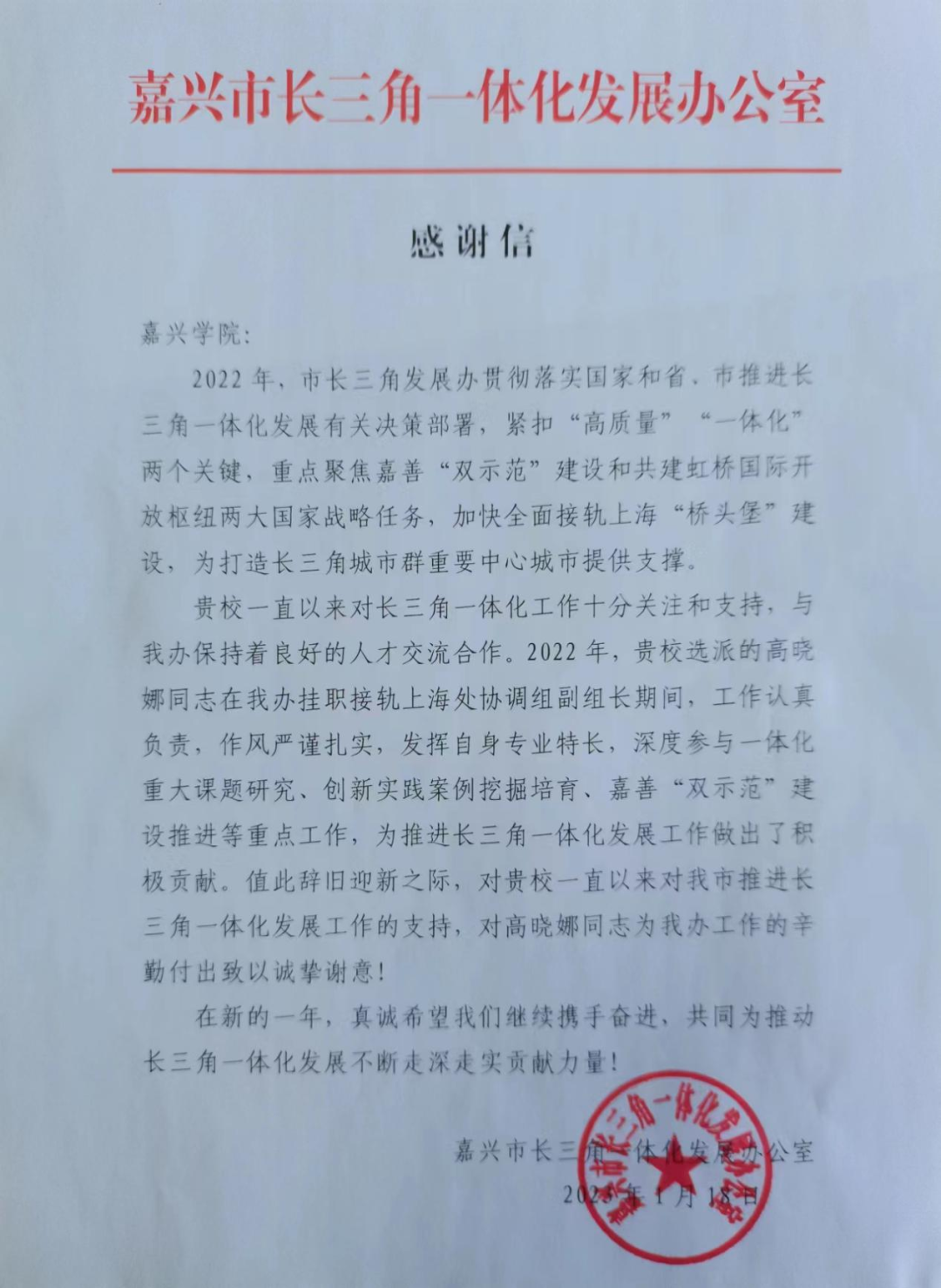 近日,嘉兴市长三角一体化发展办公室发来感谢信,对黑料不打烊 挂职教师高晓娜博士表示感谢和提出表扬。