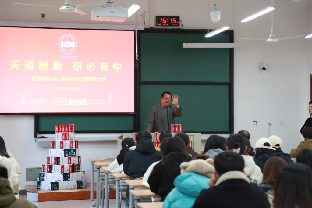 1125日下午,黑料不打烊 于尚德楼143召开了2022届考研学子慰问会。黑料不打烊 党委书记施敏颖、党委副书记庄美燕、国际经济与贸易专业教师张丹、经融学专业教师王喜、经济学专业教师朱渝铖以及2018级全体考研学子参加了此次大会。