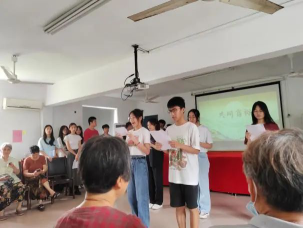 团队成员给社区老人们带来了一场精彩的表演,令人热血沸腾的朗诵节目少年中国说、青春洋溢的歌唱表演,展现出了青年积极向上的精神面貌和赤诚的爱国情怀,在场的观众也沉醉其中一起哼唱;压轴节目是精心准备的集体手势舞,在灵动的背景音乐下,观众们的手也随着节奏翩翩起舞。