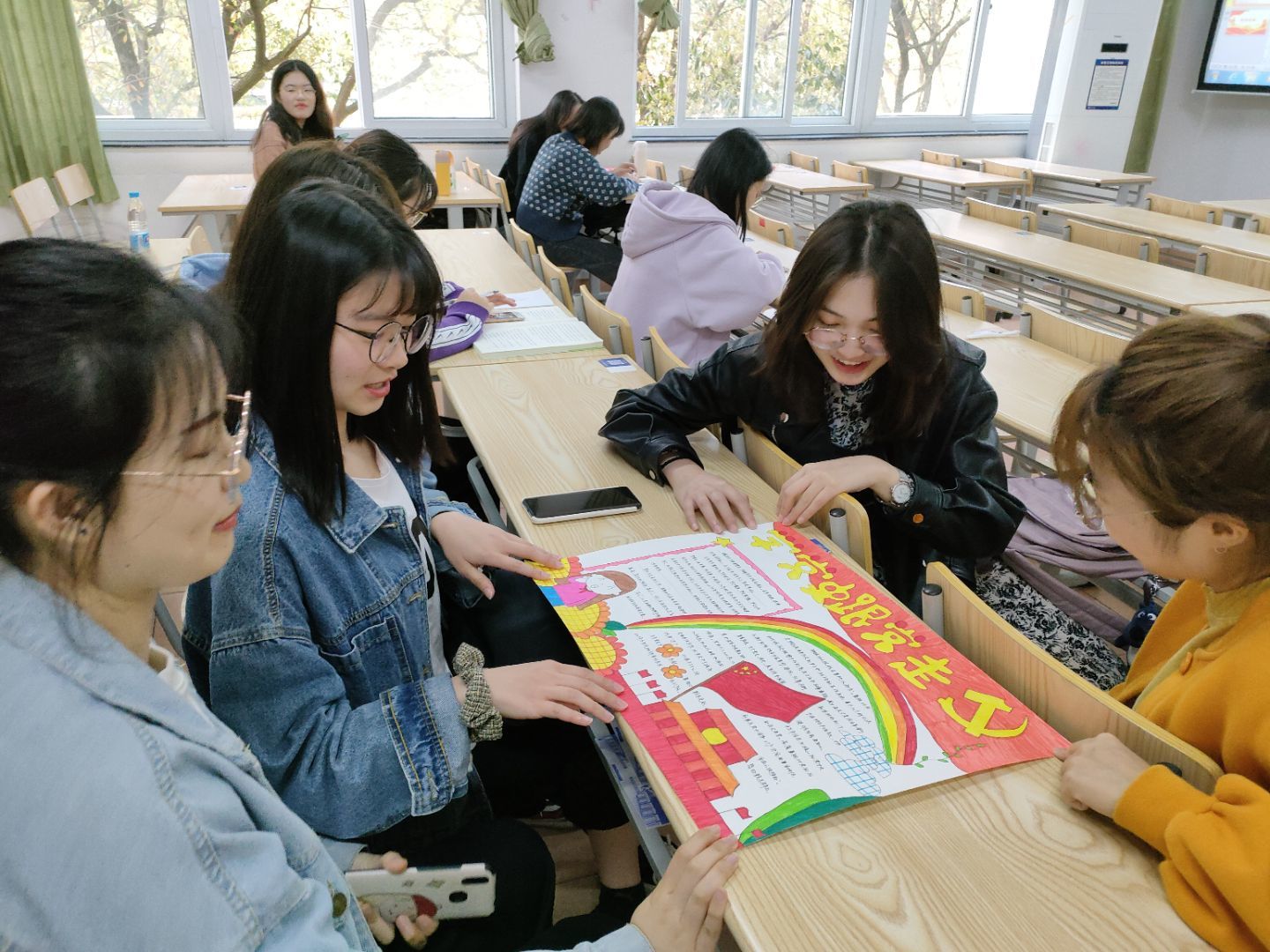 其次,全体同志相互传阅“学党史,悟初心”手抄报,并分享了自学党史、自制手抄报的过程和感悟。韩瑜琳表示以绘制手抄报的形式学习党史的这种形式很新颖小组分工协作,搜寻了大量关于党史的资料,收获颇多。在庄严的国歌声中结束本次活动。