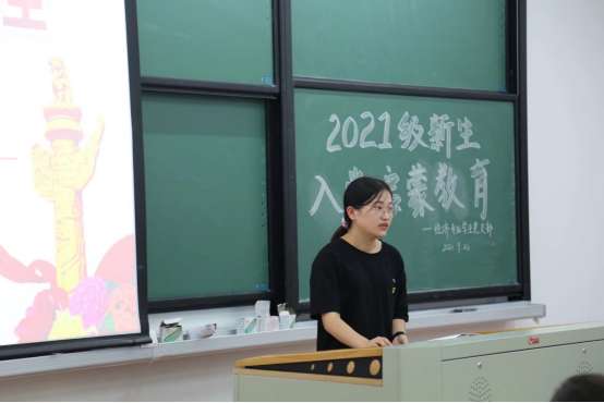 经济专业学生党支部沈逾莹同志向新生介绍了支部概况、党员发展的基本程序和相关要求,同时对入党申请书和思想汇报的规范性进行了强调。