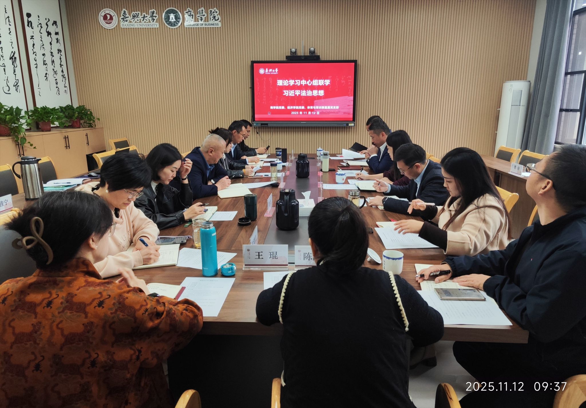 党委与体育与军训部直属党支部联合开展理论学习中心组联学活动,以习近平法治思想为核心主题深化专题研学。校党委宣传部部长王火红莅临现场指导,商学院党委书记虞岚主持本次会议。