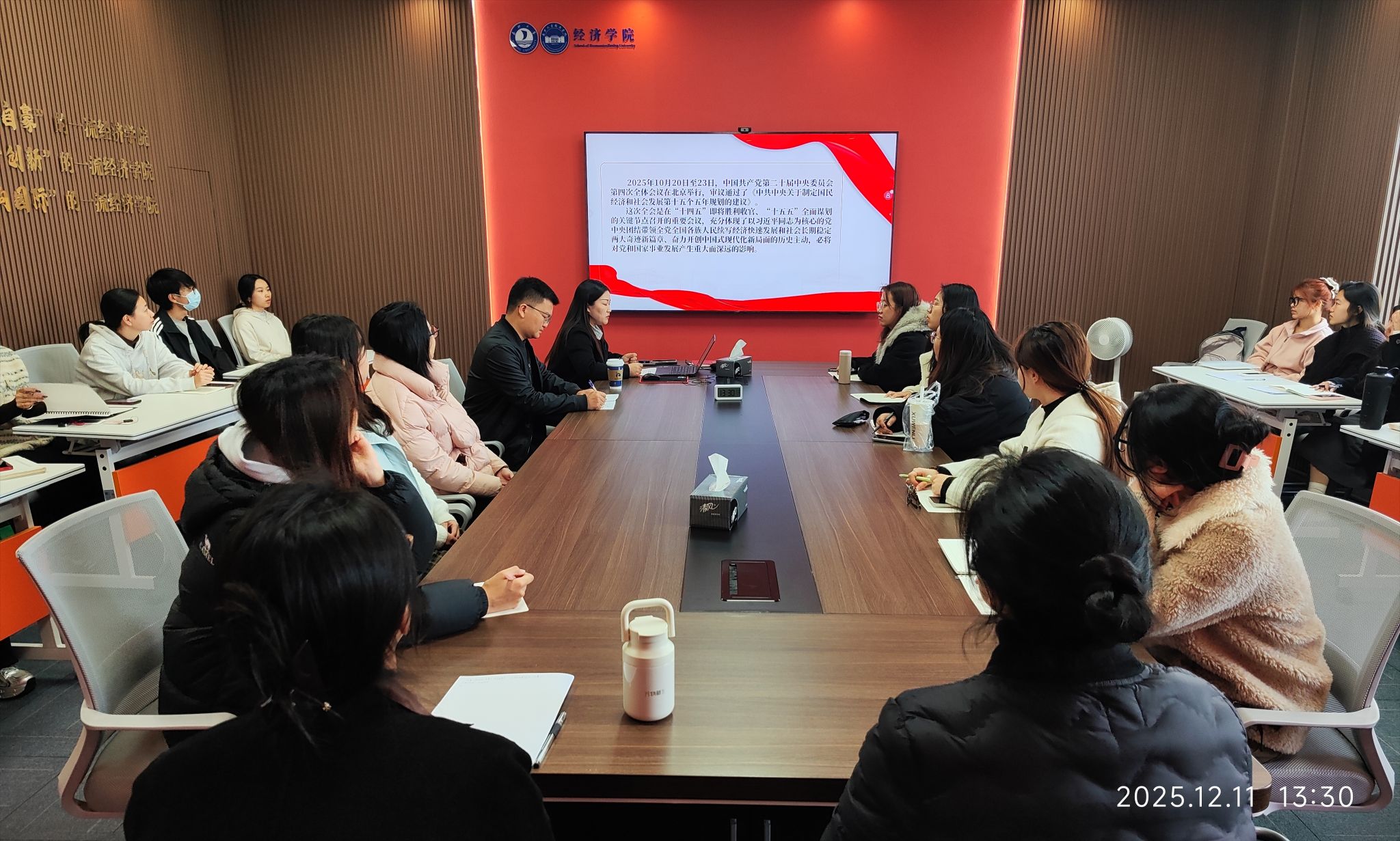 蔡运男围绕三个维度展开宣讲。她指出,党的二十届四中全会是“十四五”收官与“十五五”谋划关键节点的重要会议,审议通过的《中共中央关于制定国民经济和社会发展第十五个五年规划的建议》,为中国式现代化提供了纲领性指引。全会提出的高质量发展、新发展格局、高水平科技自立自强等重大部署,与学院办学方向高度契合,为学院高质量发展带来重大机遇。